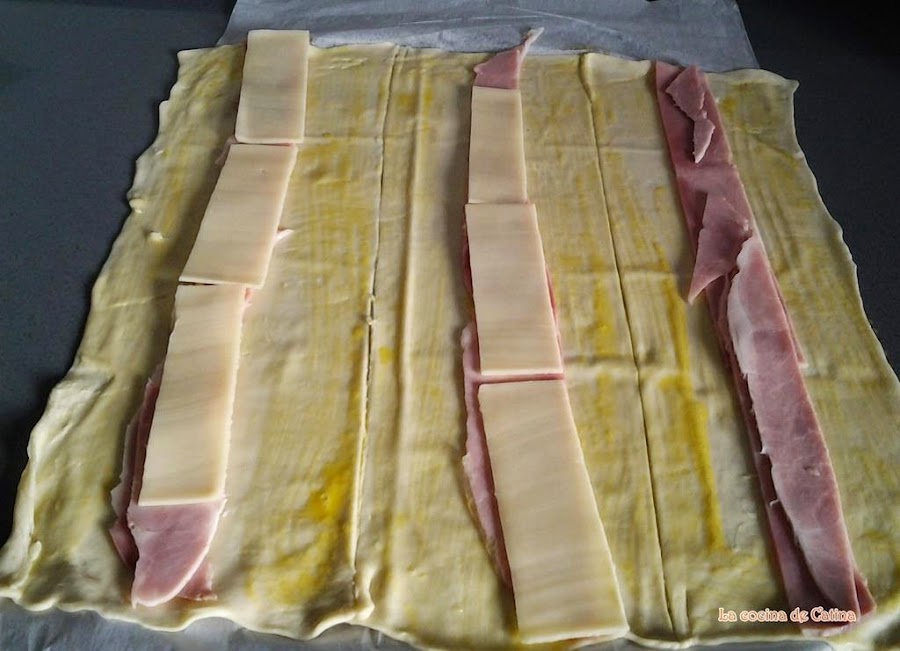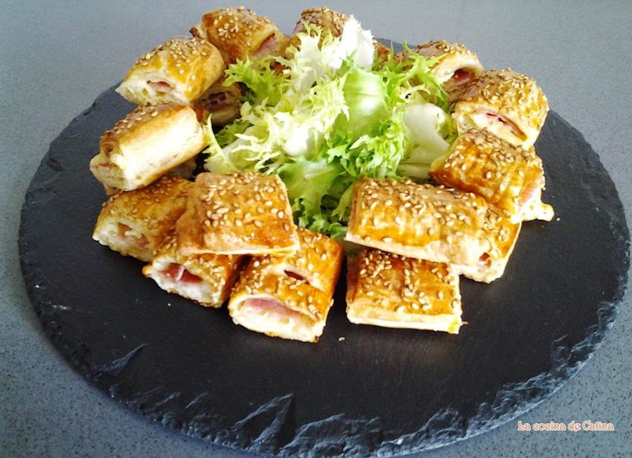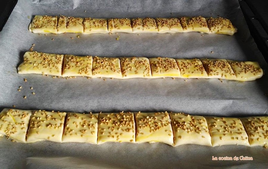Extender con el rodillo la lámina de hojaldre y dividirla en tres partes a lo largo, pintamos estas tiras con huevo batido, cortamos las lonchas de jamón york también en tres partes al igual que las lonchas de queso. En el centro de cada trozo de hojaldre ponemos tiras de jamón york y de queso, doblamos las tiras formando un canutillo, las colocamos en una bandeja de horno con papel de horno, las pintamos con el huevo batido y espolvoreamos con el sésamo. Metemos al horno precalentado previamente, a temperatura de 200 grados y le damos unos 15 minutos de cocción.