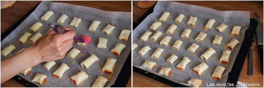 Colocamos nuestros saladitos sobre papel de hornear en la bandeja de horno, dejando espacio entre ellos para que cuando aumenten su volumen no se peguen. Pintamos con huevo batido para sellar bien y no se abran.