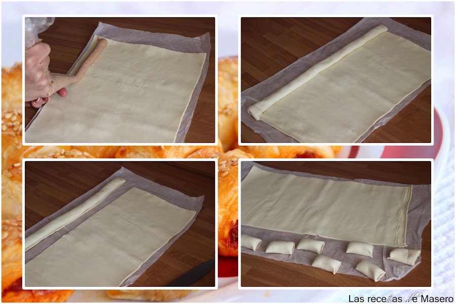 Vamos repitiendo cada uno de estos pasos con los distintos sabores hasta terminar la lámina de hojaldre. Podéis ver todo el proceso en el montaje de abajo.
