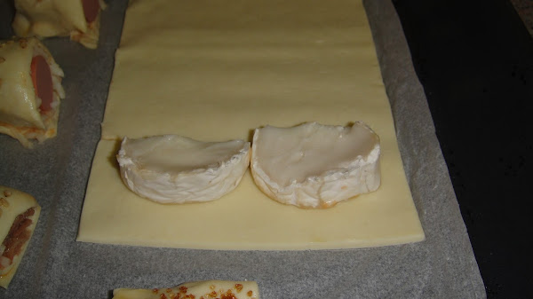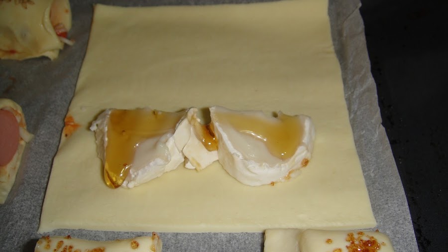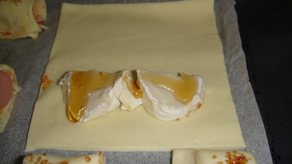 Cortamos un medallón pequeño de queso de cabra y lo partimos por la mitad, lo ponemos sobre el hojaldre, le echamos un poco de miel, y lo envolvemos. Lo pintamos con huevo batido y le echamos azúcar moreno. El queso de cabra concuerda muy bien con los sabores dulces.
