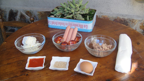 Hacemos el mismo procedimiento que con el de salchicha, cambiando la salchicha por atún. Pintamos con huevo batido y esparcimos semillas de sésamo.
