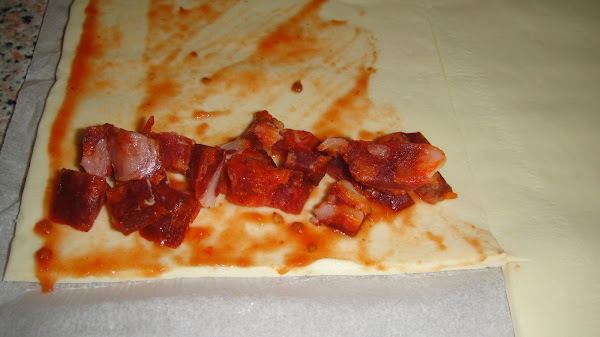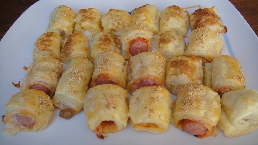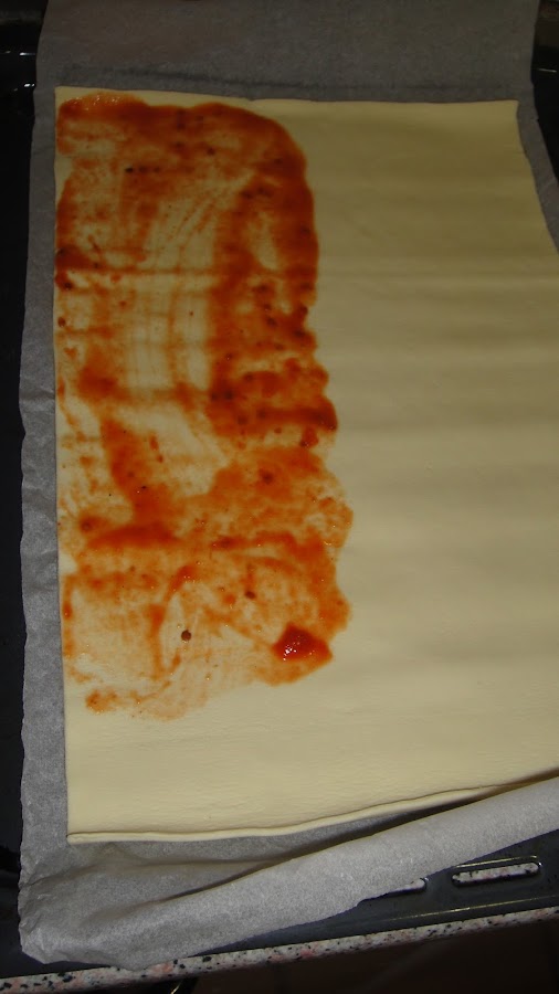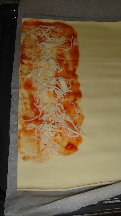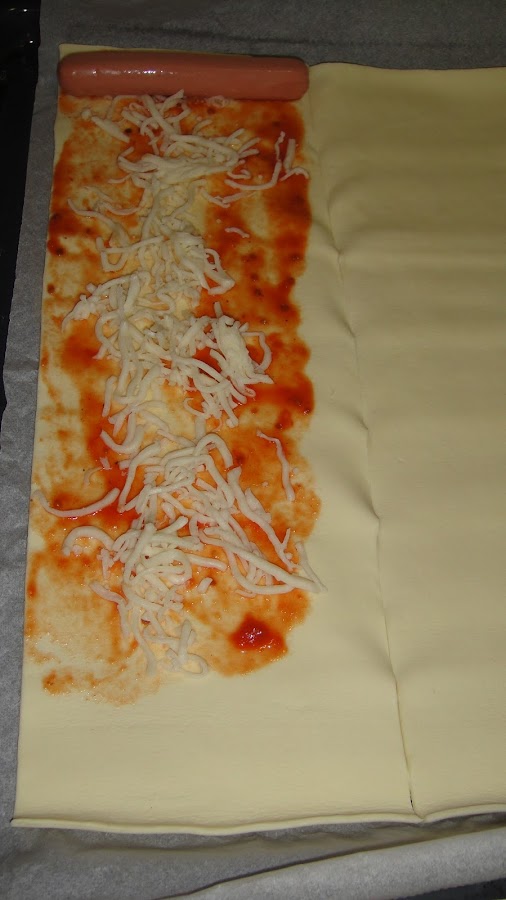 Echamos tomate casera en una mitad del hojaldre, lo extendemos bien y ponemos mozarella, colocamos la salchicha en la parte de arriba y la enrollamos, cortamos el hojaldre y hacemos lo mismo con el resto de hojaldre.