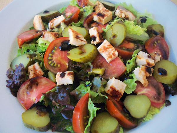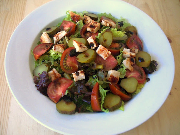 Unas hojasde lechuga, en este caso de hoja de roble, un tomate, espárragos verdes, pepinillos en vinagre y una pechuga de pavo a la plancha. Aderezada con un poquito de aceite de oliva y vinagre de jerez.