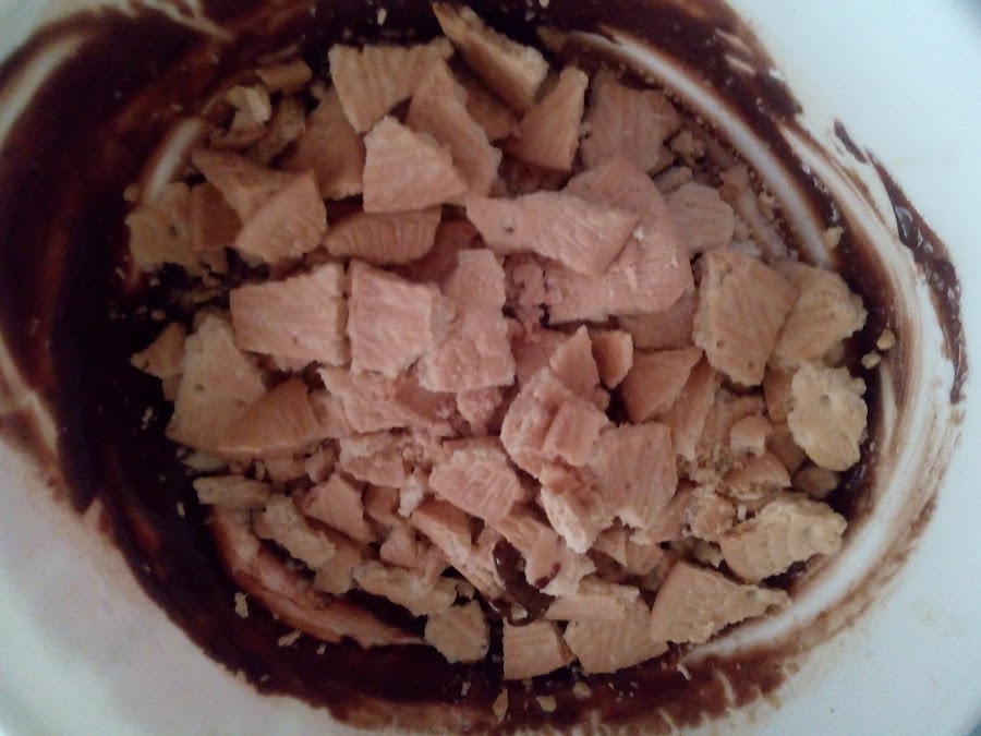 Agregamos las galletas partidas en trozos grandes y mezclamos bien.