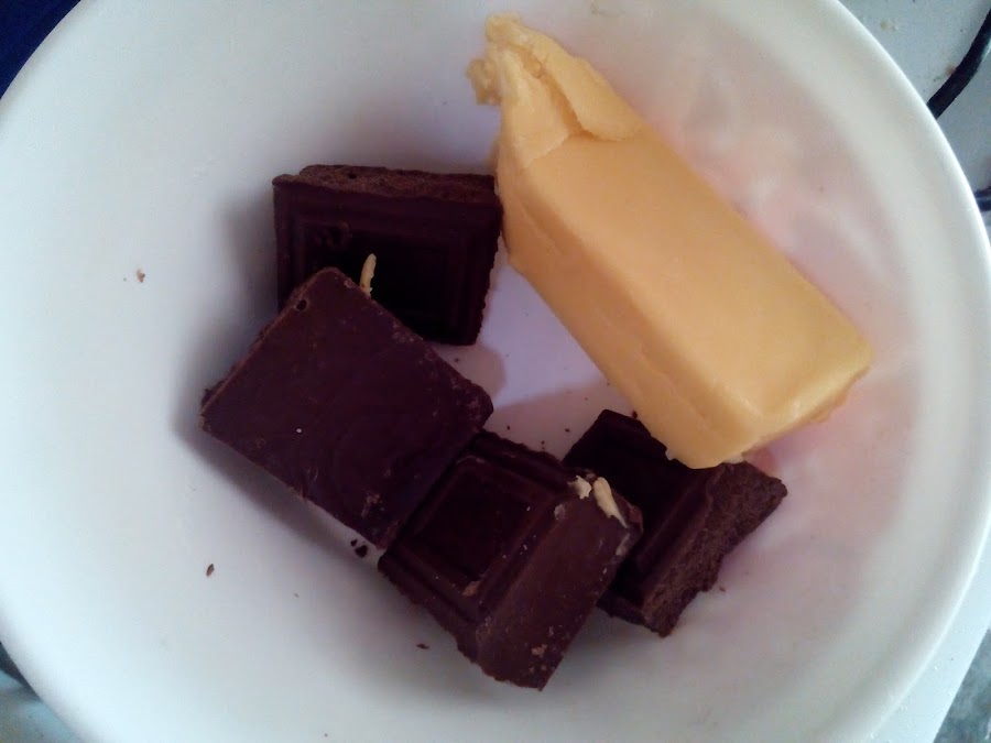 Derretimos en el microondas o en baño María la mantequilla con el chocolate.