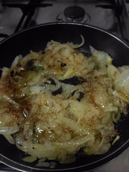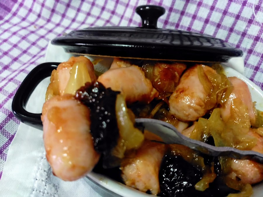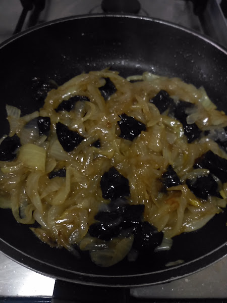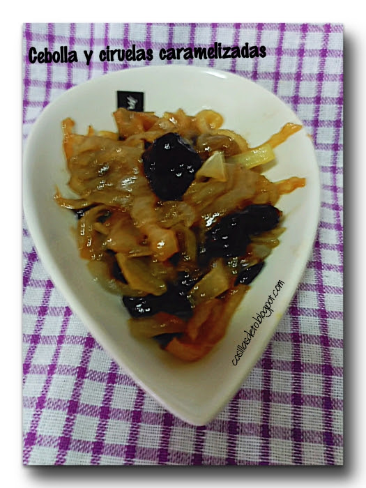 3. En otra sartén vamos pochando la cebolla ,fuego medio y vigilando porque se pude quemar, pasando unos minutos ponemos la azúcar y seguimos removiendo ponemos un chorrito de vinagre balsámico de manzana o de Módena, dejar que poche un poco y añadir las ciruelaspicadas en 4 trozoz