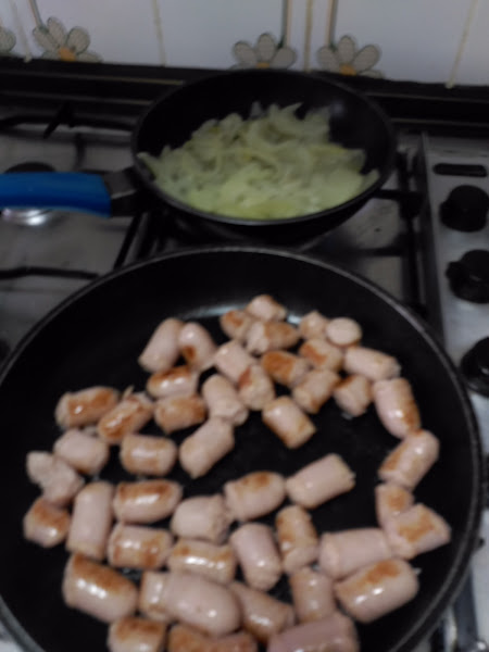 2. cortamos las salchichas ,a mi me gusta mas así y se hacen antes, la ponemos en una sartén y las vamos friendo yo pongo poca aceite,como si fueran a la plancha casi : )