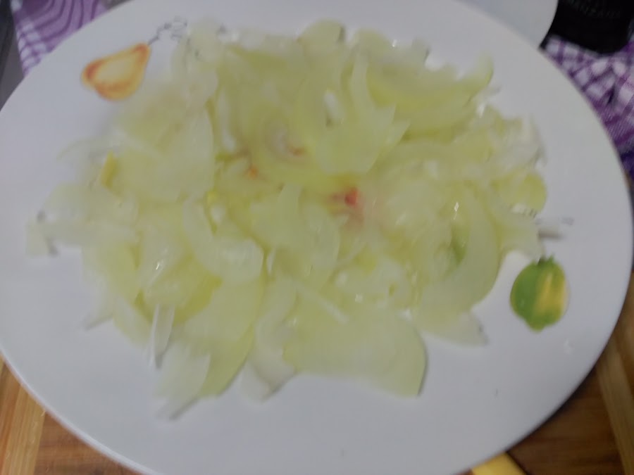 1. cortamos la cebolla finita la ponemos en un plato, echamos un chorro de aceite de oliva y la ponemos en el microondas a su máxima potencia unos 3 minutos (es un truco para que se poche antes )