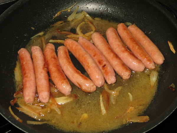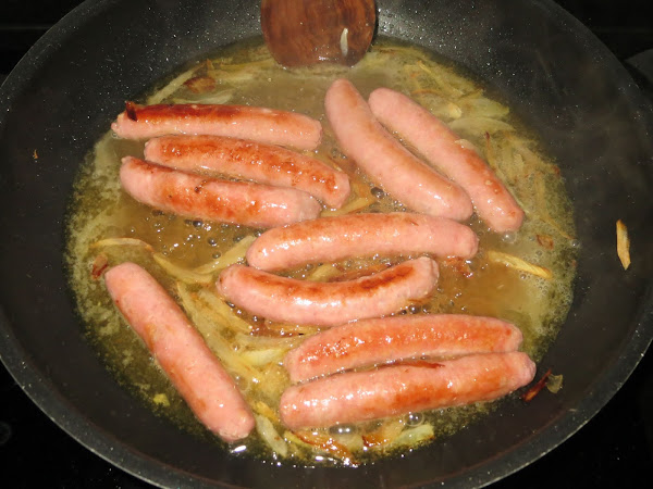 Lo primero es que partimos la cebolla de la manera que más nos guste y en un wok o en una sartén amplia echamos un poco de aceite y comenzamos a dorar la cebolla a fuego medio cuando esté transparente añadimos las salchichas saladas y las tostamos.