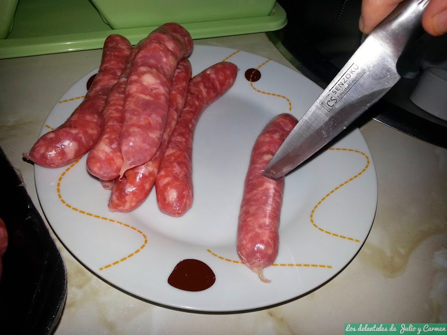 Mientras se pocha la cebolla y el pimiento, haremos pequeños cortes en cada una de las salchichas.