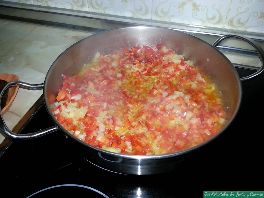 En una fuente amplia, verteremos un poco de aceite y a fuego medio-bajo, pocharemos la cebolla y el pimiento. Lo removeremos de vez en cuando.