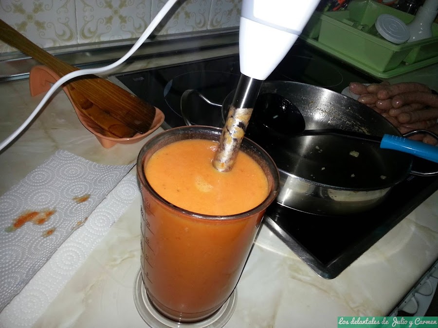 Verteremos las verduras y el caldo en el vaso de la batidora y batiremos hasta que la salsa quede espesa.
