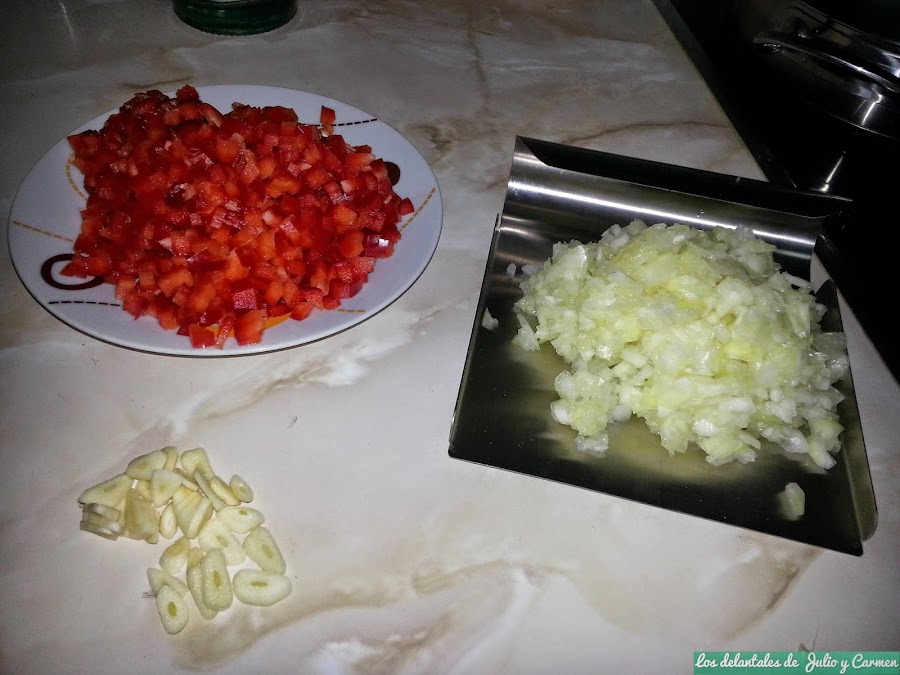 Lo primero que haremos será cortar el pimiento y la cebolla lo mas finito que podamos, y los dientes de ajo los pelaremos y cortaremos en laminas. Reservaremos.