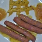 Cuando empiecen a dorarse las salchichas, las empapamos bien con el cava, ponemos también la pera en trocitos y el zumo de 2 mandarinas.