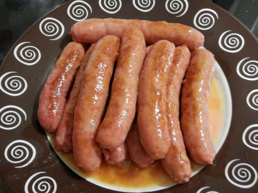 Disponemos todas las salchichas en una fuente y regamos con el caldo que queda de freír.