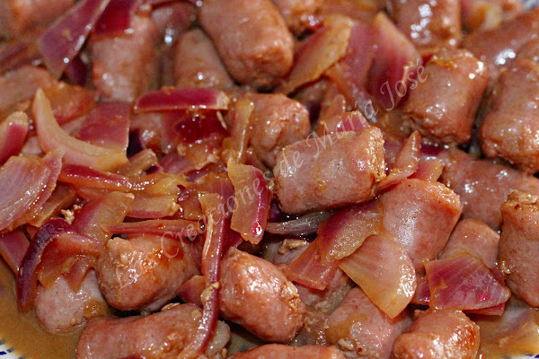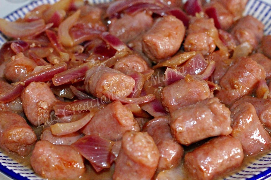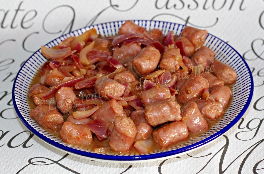 Cuando la cebolla se empiece a dorar echamos las salchichas y el vermut.