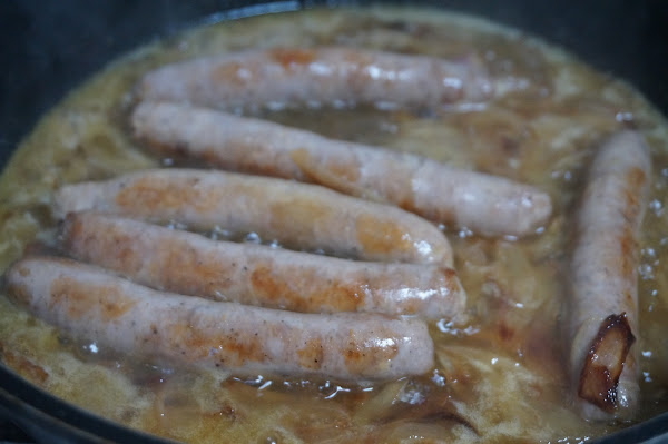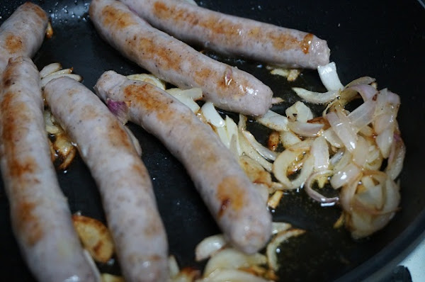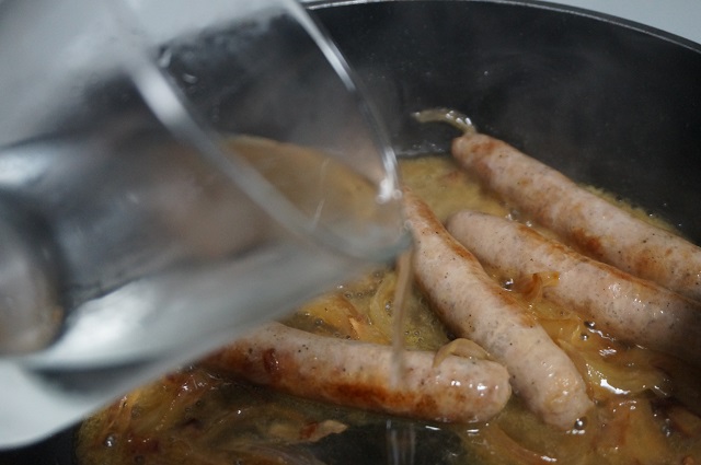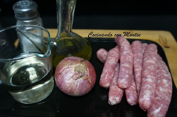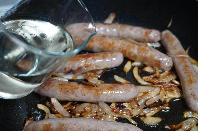 Cuando se haya dorado la cebolla y las salchichas, añadimos el vino blanco. Dejamos que se evapore el vino un par de minutos y añadimos un vaso pequeño de agua o caldo y un poquito de harina de maíz disuelta en en agua o el caldo.