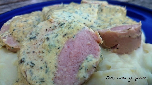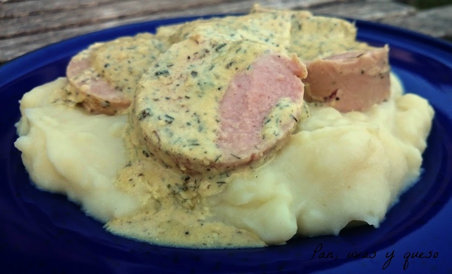 Una vez que las salchichas están listas, servimos una porción de puré en el plato y encima colocamos las salchichas, regándolas con la salsa.