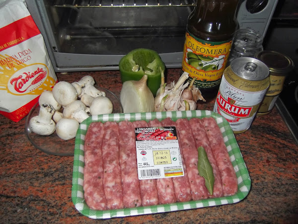 Lo rehogáis todos durante 15 minutos hasta que está cocinado, luego añadís los champiñones cortados y lo dejáis cinco minutos más. Mientras tanto vais pinchando las salchichas, para que no os salten, y las añadimos a la sartén.