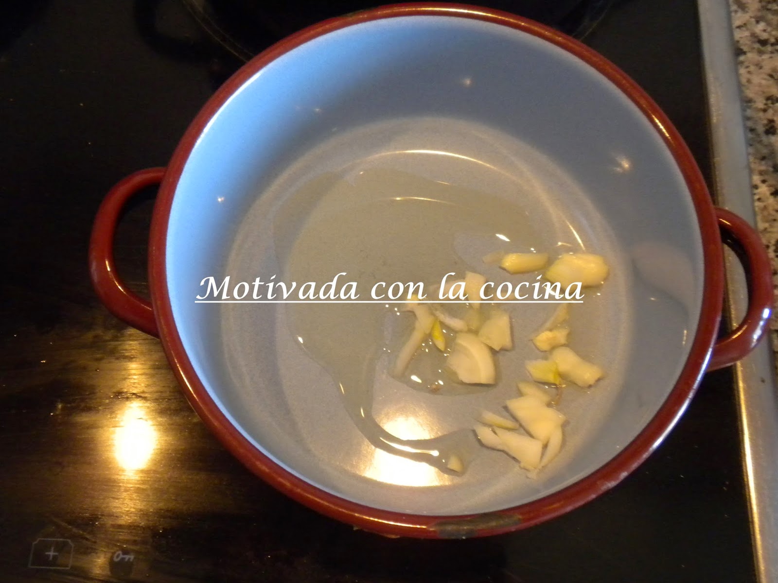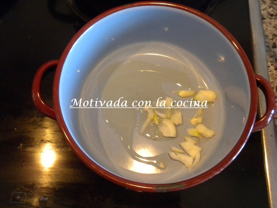 1. Echar en una cazuela, un chorrito de aceite con unos ajitos y trocitos de cebolla.