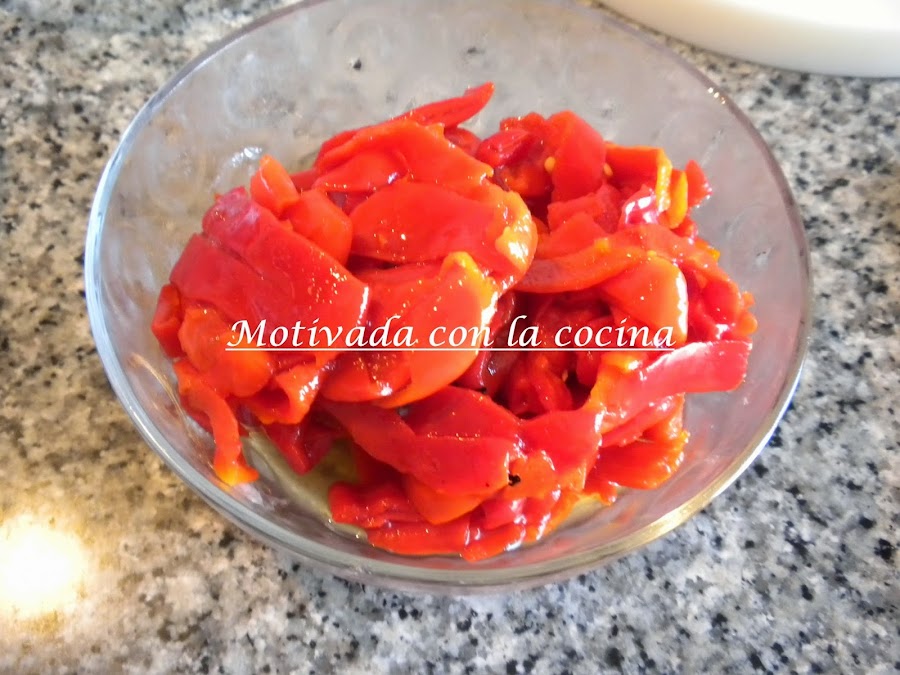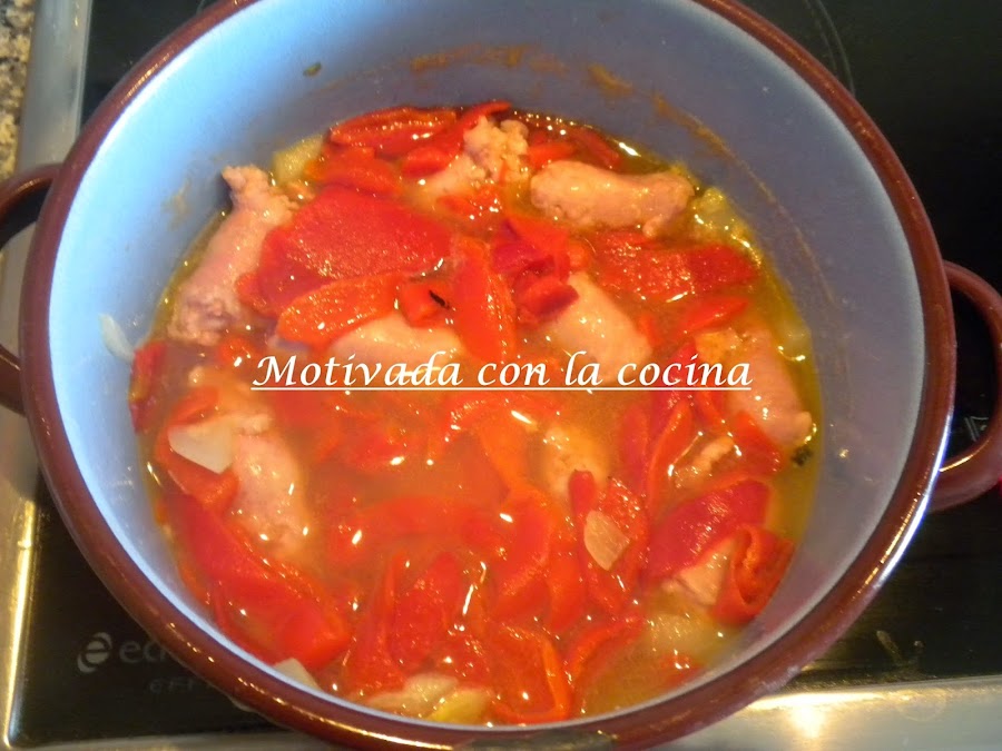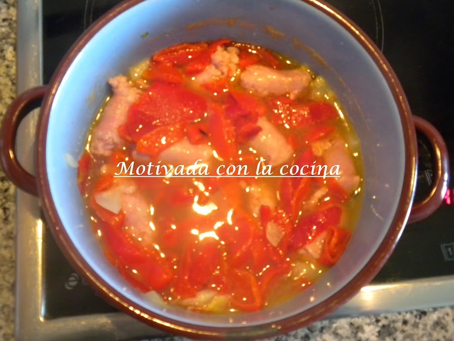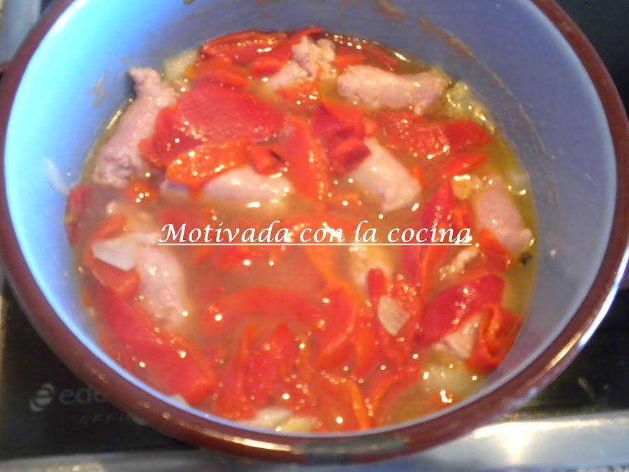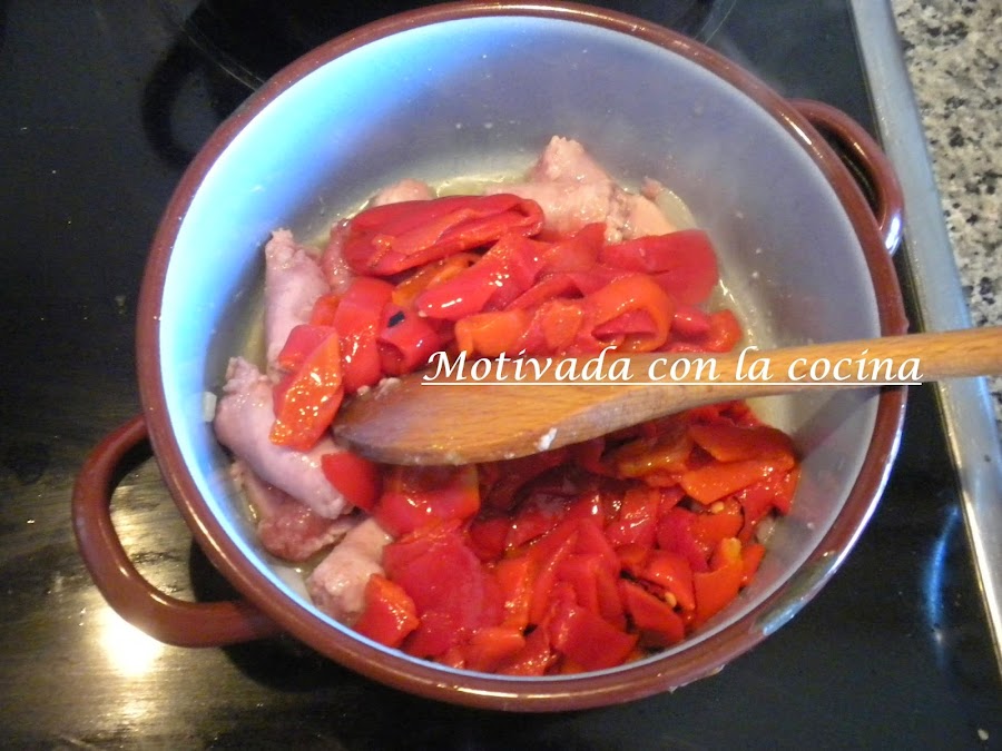 3. Se añaden las tiras de pimiento rojo y se remueven para que no se peguen ni se deshagan.