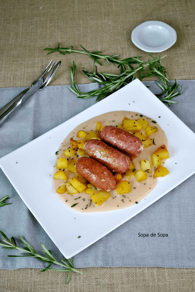 Salchichas con puré de alubias y patatas al romero
