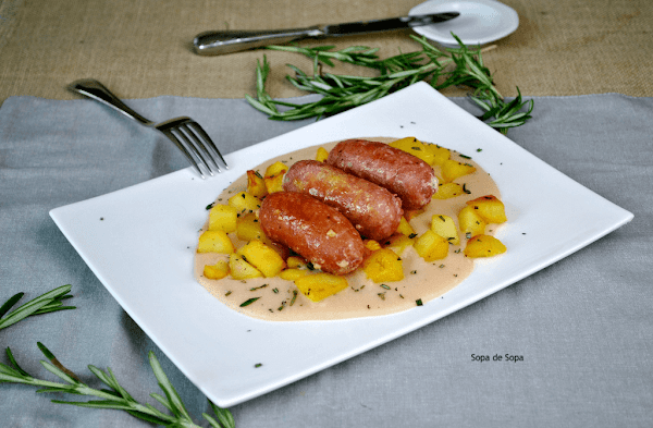 Para servir poner en los platos una cama de puré, repartir por encima las patatas, espolvorear con un poco de romero más y colocar la salchicha encima.