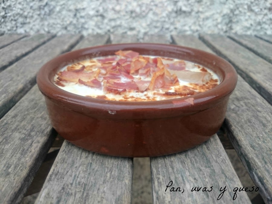 Colocamos las salchichas en una fuente apta para el horno (yo utilicé cazuelas de barro individuales). Cubrimos con la salsa y repartimos la panceta troceada por encima.