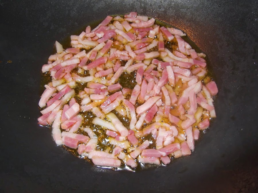 En una sartén o cazuela ponéis un buen chorro de aceite a fuego fuerte para freír el bacon y que se os quede doradito. Tened cuidado que os puede saltar. Cuando lo tengáis frito lo sacáis a escurrir a papel absorbente y reserváis.