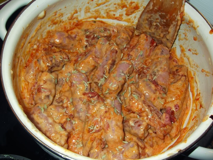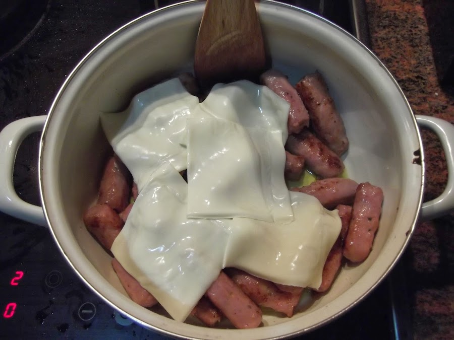 En ese mismo aceite freís las salchichas salpimentadas, yo las he cortado en trozos para que fueran más cómodas de comer, pero eso va al gusto. Cuando ya tenéis fritas todas las salchichas, os fijáis en que estado se encuentra el aceite si está muy sucio lo cambiáis y si no lo dejáis. Encima de las salchichas, yo las cambié de sartén a olla para que me fuera más fácil transportarlas, pero podéis dejarlas en la sartén, se echan los tranchetes y se les da varias vueltas para que comiencen a deshacerse. Un aspecto importante es que debéis bajar el fuego, igual que antes lo teníais alto para freír la carne, ahora es mejor bajarlo para que no se os quemé la salsa.