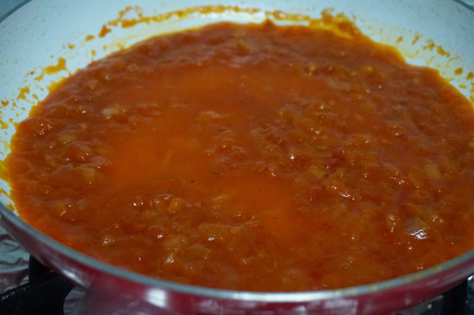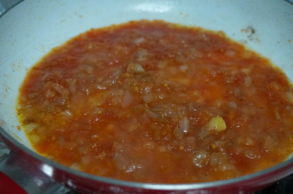 Cuando la cebolla está echaremos el tomate triturado y el tomate frito, lo dejamos a fuego lento que se haga, unos 5 minutos.