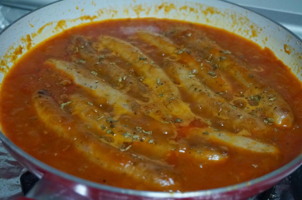 Echamos las salchichas y las dejamos hasta que la salsa esté a nuestro gusto, si queda muy espesa, podemos poner mas agua o caldo.