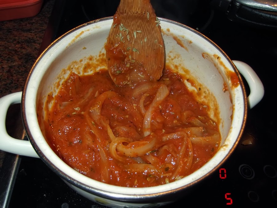 Lo primero que hacemos es echar un poco de aceite en una cacerola e ir laminando los ajos y cortando la cebolla en juliana. Lo echamos en el aceite y esperamos hasta que se dore. Una vez que veamos que está cocinada la cebolla, se añade el tomate y una cucharada de orégano y comenzamos a dar vueltas a la salsa para que se impregnen todos los sabores.