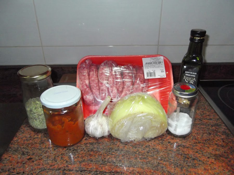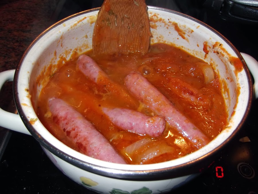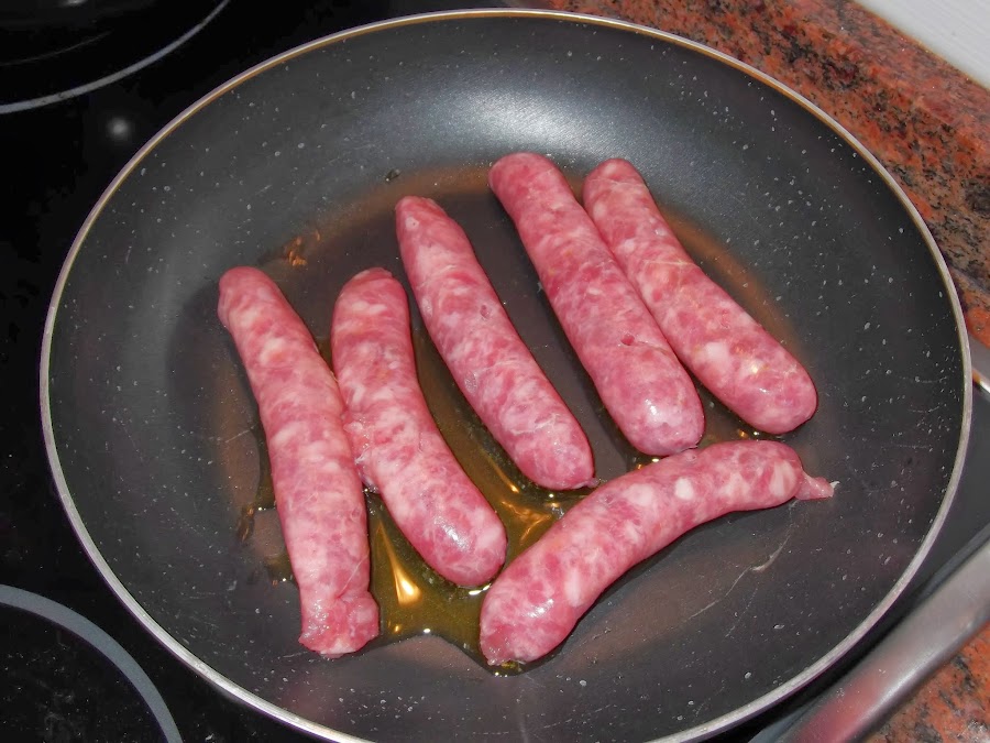 Mientras tanto colocamos una sartén con aceite y comenzamos a freír las salchichas. Si queréis salar la carne, lo tenéis que hacer ahora; aunque si el tomate es casero ya llevará sal y las salchichas también son un poco saladas, por lo que yo he decidido no añadírsela.