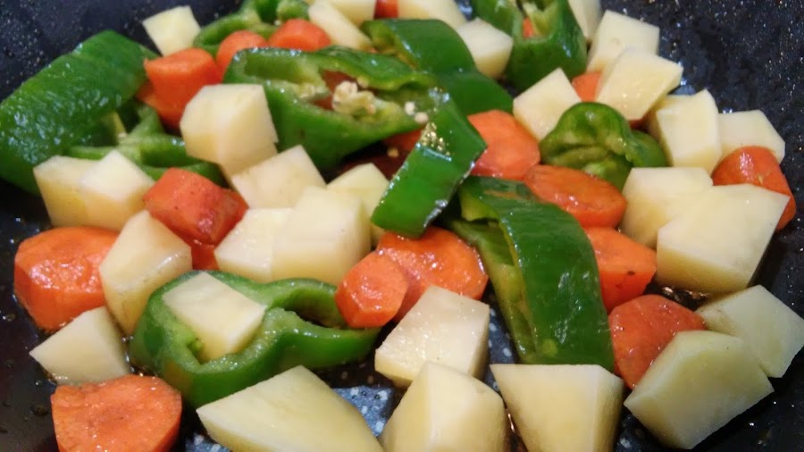 4. En el mismo aceite, echa todas las verduras, salpimenta al gusto, añade una cucharada de tomillo seco y saltea durante 1 minuto.