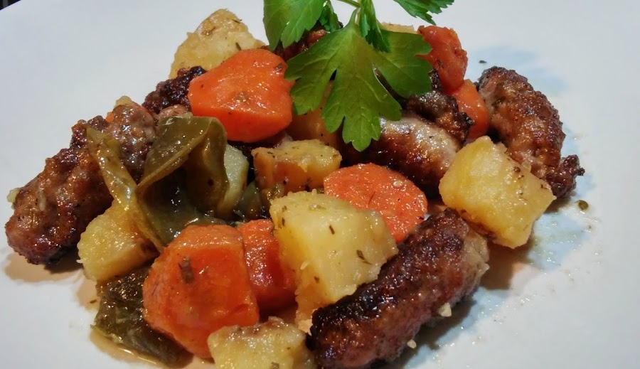 Tenía una bandeja de salchichas en la nevera y quería hacer algo diferente que no fuera las típicas salchichas con salsa de tomate. Así que con unas pocas verduritas, un chorrito de vino blanco y el buen hacer de la olla lenta, ha quedado un plato aromático y sustancioso.