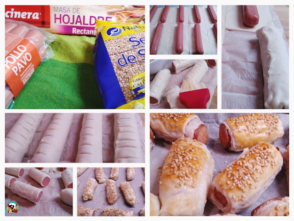 1 lamina de hojaldre, 8 salchichas de pollo/pavo.