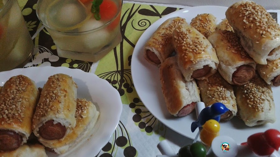 1.- Estiramos el hojaldre, ponemos sobre ella las salchichas en fila, dejando un espacio entre cada una. Cortamos el hojaldre en tiras y luego a rectángulos, envolvemos las salchichas en cada rectángulo.