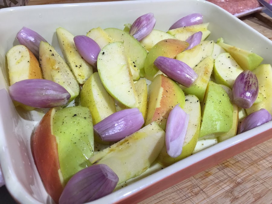 3. En una bandeja de horno ponemos un chorrito de aceite de oliva virgen extra en la base. Encima colocamos los gajos de manzana y las chalotas. Cubrimos con el zumo del medio limón para evitar que las manzanas se oxiden. Salpimentamos y ponemos dos cucharadas de aceite de oliva virgen extra por encima. Con las manos mezclamos para asegurarnos que el zumo de limón y el aceite quede bien repartido.