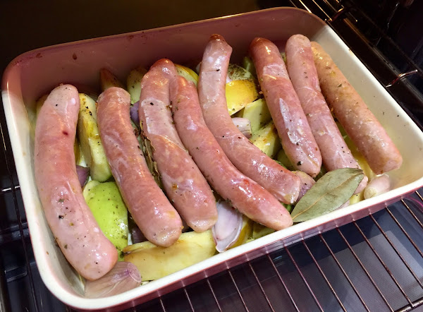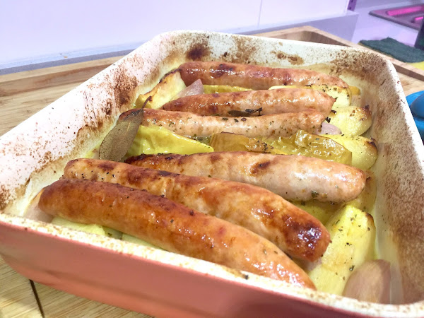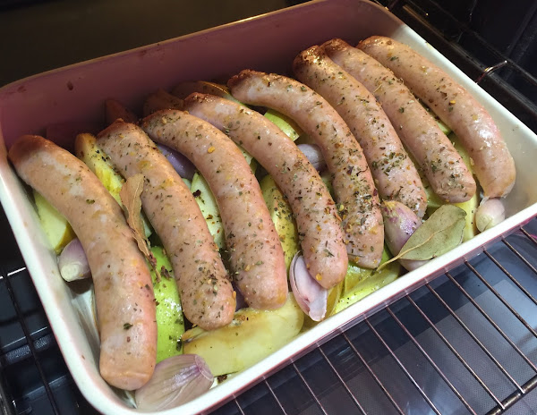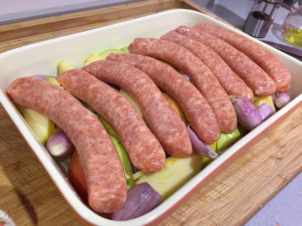 4. Colocamos las salchichas encima de las manzanas y las chalotas y horneamos 10/15 minutos a 180ºC.