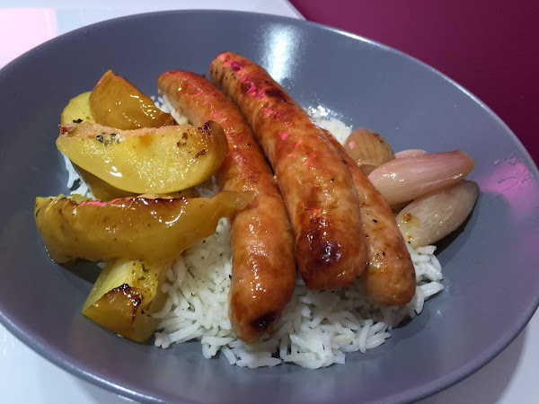 7. Servimos el arroz blanco en la base del plato y encima las salchichas con la guarnición de manzana y chalotas. Ponemos el juguito del vino blanco por encima.