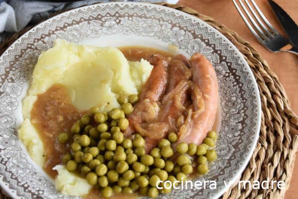 Y tan solo nos queda servir las salchichas en salsa de cebolla con el puré de patatas y los guisantes calientes y tendremos un plato delicioso.