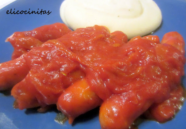 Cuando la tenemos medio hecha, añadimos las salchichas y dejamos que se haga todo junto.