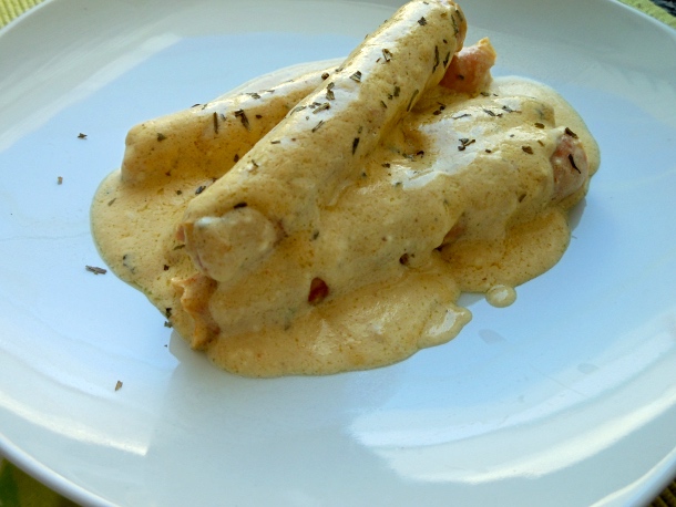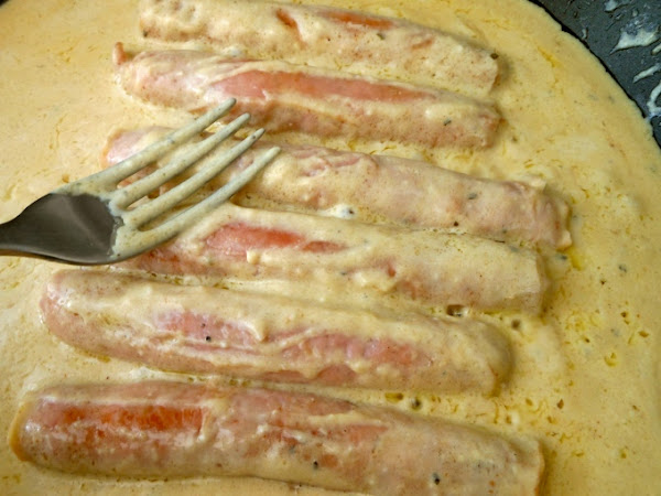 Tras esto vierte la salsa por encima de las salchichas y caliéntalo todo junto a fuego medio durante cinco minutos.