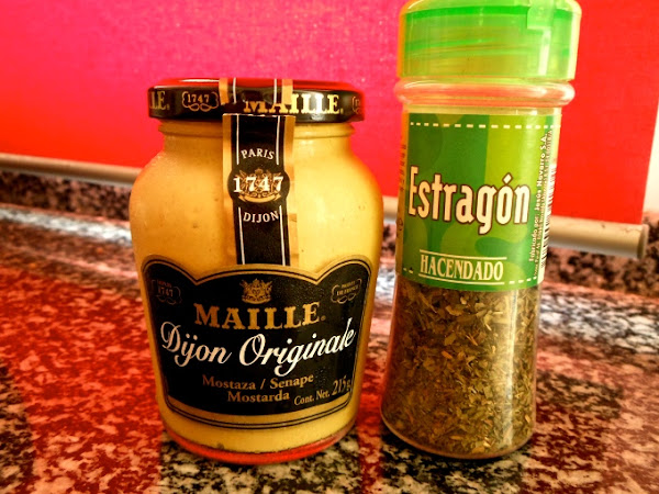 Cuando la pastilla de caldo esté disuelta, baja el fuego al nº 4 de la placa vitrocerámica y añade la cucharada de mostaza de Dijon, la nata (crema de leche), la media cucharadita de estragón y una poquita de pimienta negra molida. Remueve con tu cuchara de madera y deja cocer durante 10 minutos, removiendo de vez en cuando.