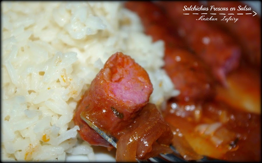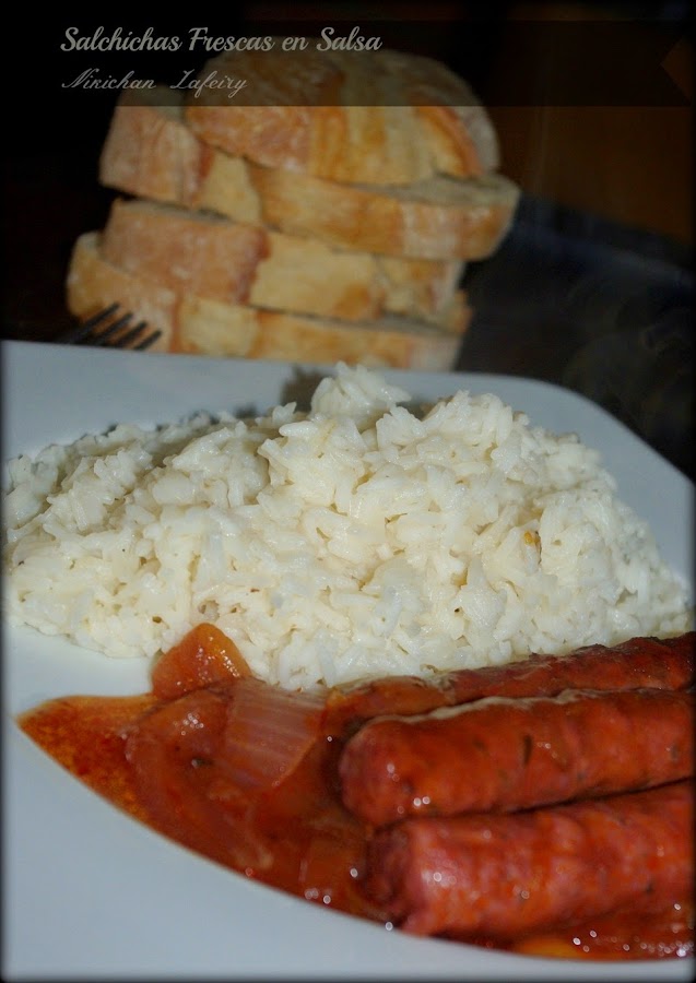 Hoy vamos a preparar un plato sencillo pero muy sabroso. Unas salchichas frescas en salsa con arroz para acompañar. Apenas tiene preparación y sale muy rico. Es importante que no se os olvide comprar el pan para mojar en la salsa. Vamos con la receta!