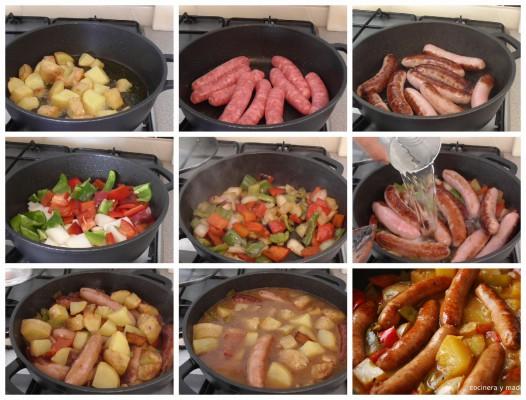 Retiramos las patatas doradas y las reservamos y quitamos el exceso de aceite dejando unas gotas; en la misma sartén y a fuego vivo doramos superficialmente las salchichas, sacamos y reservamos.