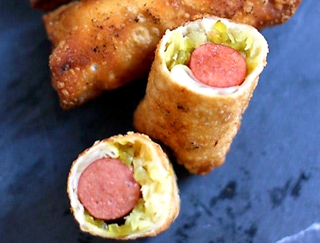 En un tazón mezcle la harina,polvo de hornear y sal luego agregar el huevo mezcle,agregar agua fría poco a poco hasta obtener una pasta que al introducir una cuchara se cubra y chorree ligeramente,colocar a cada trocitos de salchichas una rebanada de queso y un poco de pepinillos,luego poner en la mezcla a cubrir ahora freír en el aceite caliente dejar hasta dorar,ya listo colocar en papel toalla para eliminar exceso de grasa,servir calientes con salsa de tomate ketchup y mostaza o a gusto.