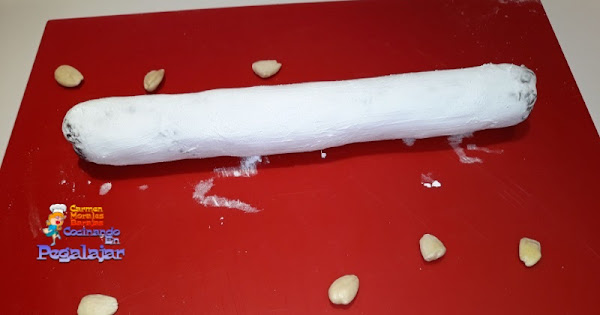 Cuando esté bien frío, lo desenvolvemos y lo pasamos por azúcar glas que se impregne bien y parezca la piel del salchichón.