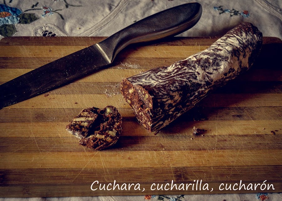 La idea circulaba por la red como un clásico trampantojo, y la receta la adaptó una amiga de la versión de tarta de chocolate favorita de su hija. La combinación es un éxito total puesto que en versión "salchichón" resulta un postre delicioso, con la cantidad justa para tomar algo dulce sin llegar a cansarte... aunque también os digo que una vez empiezas a cortar rodajas, es difícil parar de picar!